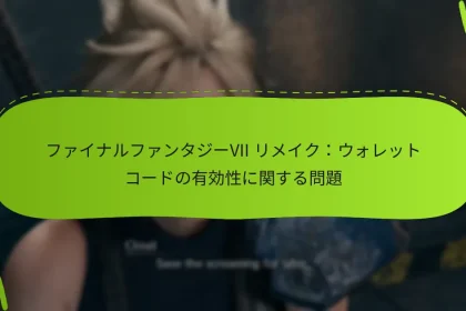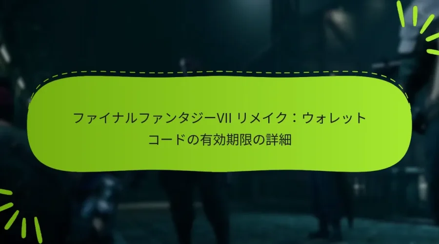 ファイナルファンタジーVIIリメイクのウォレットコードには、プレイヤーが資金を失わないように注意すべき特定の有効期限があります。これらのコードは、プロバイダーの条件に応じて、購入後数ヶ月から1年の間に期限が切れることがあります。一度期限が切れると、関連する残高にアクセスできなくなり、購入や転送の選択肢が制限されます。 ファイナルファンタジーVIIリメイクのウォレットコードの有効期限の詳細は何ですか? ファイナルファンタジーVIIリメイクのウォレットコードには、ユーザーが資金を失わないように認識しておくべき特定の有効期限があります。これらのコードは、プロバイダーが設定した条件に応じて、購入後数ヶ月から1年の間に期限が切れることがあります。 ウォレットコードの有効期限 ファイナルファンタジーVIIリメイクのウォレットコードは、一般的に購入日から6ヶ月から12ヶ月の範囲内で期限が切れます。正確な期間は、プロモーションオファーや特定の小売業者のポリシーによって異なる場合があります。コードに関連する条件を常に確認して、有効期限を確認してください。 一部の小売業者は、レシートやパッケージに印刷された有効期限を提供する場合がありますが、他の小売業者は確認メールにこの情報を含めることがあります。これらの詳細を追跡することで、ウォレットコードを期限内に使用できるようにすることができます。 ウォレットコードの有効性を確認する方法 ファイナルファンタジーVIIリメイクのウォレットコードの有効性を確認するには、コードを引き換える予定の公式ウェブサイトまたはプラットフォームにアクセスしてください。ほとんどのプラットフォームには、コードの検証のための専用セクションがあり、そこでコードを入力してそのステータスを確認できます。 さらに、アカウント設定でウォレット残高や保留中の取引に関する情報を見つけることができる場合があります。これにより、コードとその有効期限を効果的に追跡できます。 期限切れのウォレットコードの影響 ファイナルファンタジーVIIリメイクのウォレットコードが期限切れになると、通常、そのコードに関連する資金へのアクセスを失います。これは、ゲーム内購入やその他のコンテンツの引き換えができなくなることを意味します。期限切れのコードは一般的に回復不可能であり、価値の永久的な喪失につながります。 一部の小売業者は猶予期間を提供したり、コードの再活性化を許可したりする場合がありますが、これは保証されていません。財務的損失を避けるために、コードが期限切れになる前に積極的に使用することをお勧めします。 期限切れのウォレットコードの回復オプション ウォレットコードが期限切れになると、回復オプションは限られます。一部の小売業者は、顧客サポートに連絡して潜在的な回復について問い合わせることを許可する場合がありますが、成功は保証されていません。連絡する際には、購入レシートや関連情報を用意しておくことをお勧めします。 稀に、コードがギフトまたはプロモーションの一部であった場合、小売業者が代替品や新しいコードを提供することがあります。ただし、これは主に小売業者のポリシーや期限切れの状況に依存します。 有効期限を追跡するためのベストプラクティス ファイナルファンタジーVIIリメイクのウォレットコードの有効期限を効果的に追跡するために、購入したすべてのコードとその有効期限の専用リストを維持してください。これは、シンプルなスプレッドシートやメモアプリを使用して行うことができます。 有効期限の数週間前に、コードを使用するように促すリマインダーを電話やカレンダーに設定してください。ウォレット残高や取引履歴を定期的に確認することも、今後の有効期限について把握するのに役立ちます。 ファイナルファンタジーVIIリメイクのウォレットコードを引き換えるにはどうすればよいですか? ファイナルファンタジーVIIリメイクのウォレットコードを引き換えるには、適切なプラットフォームのストアにコードを入力する必要があります。このプロセスにより、コードに関連するゲーム内コンテンツや通貨にアクセスでき、ゲーム体験が向上します。 ステップバイステップの引き換えプロセス ゲームプラットフォームのデジタルストア(PlayStation Store、Xbox Store、またはPCクライアント)を開きます。 通常、アカウントまたは設定メニューにある「コードを引き換える」セクションに移動します。 …